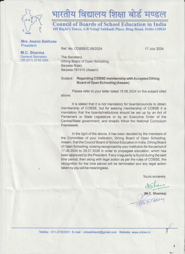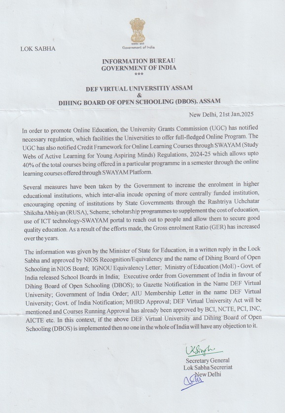 - ↪Government of India Lok Sabha Recognition Letter – Dihing Board of Open Schooling (DBOS) – Click Here