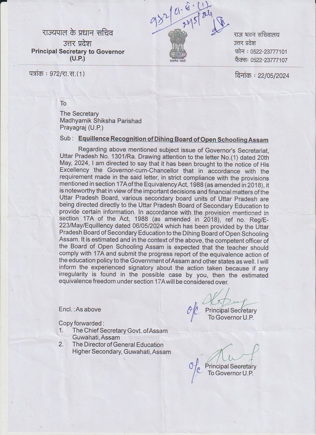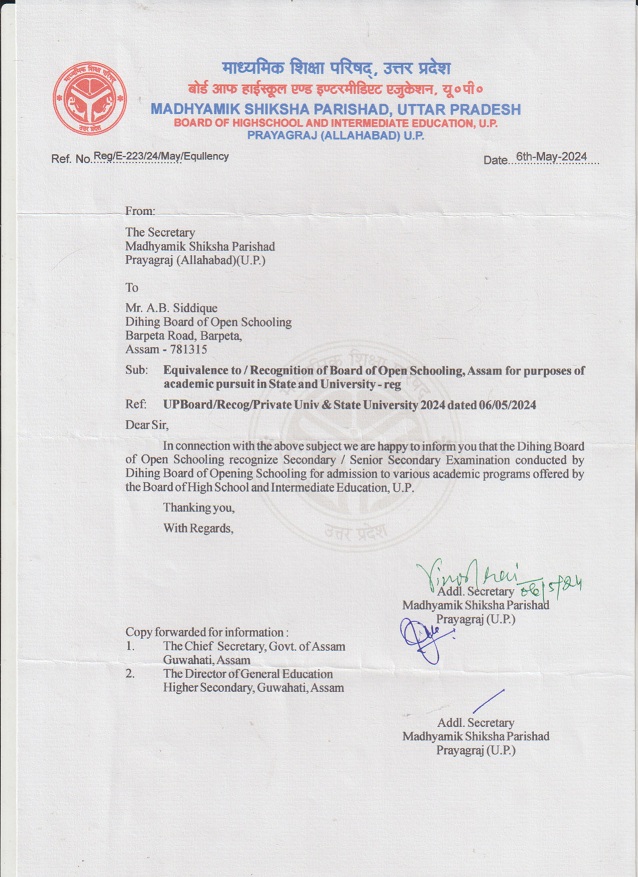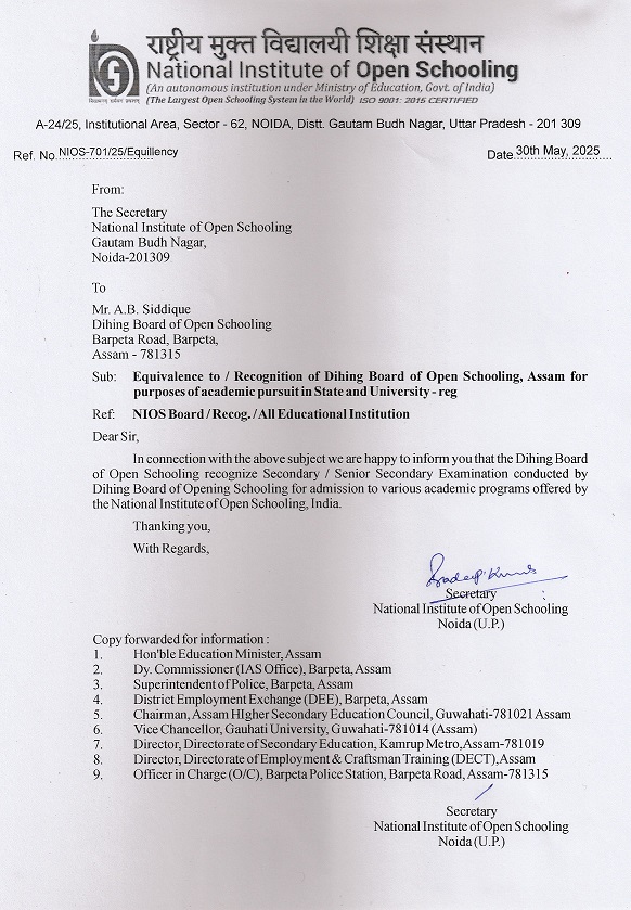 - ↪Equivalence to / Recognition of Dihing Board of Open Schooling for purposes of academic pursuit in State and University – Click Here