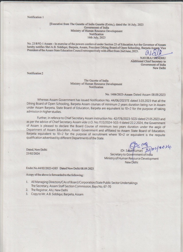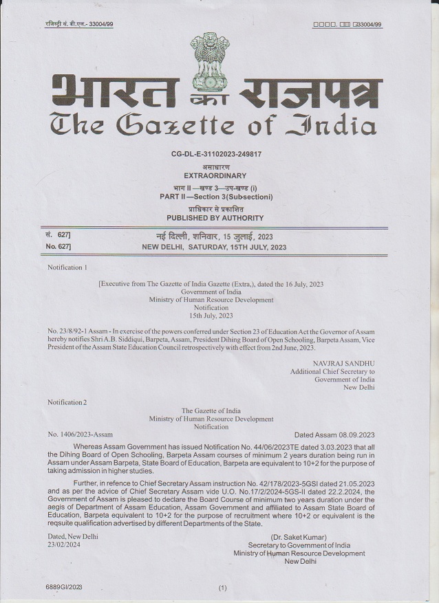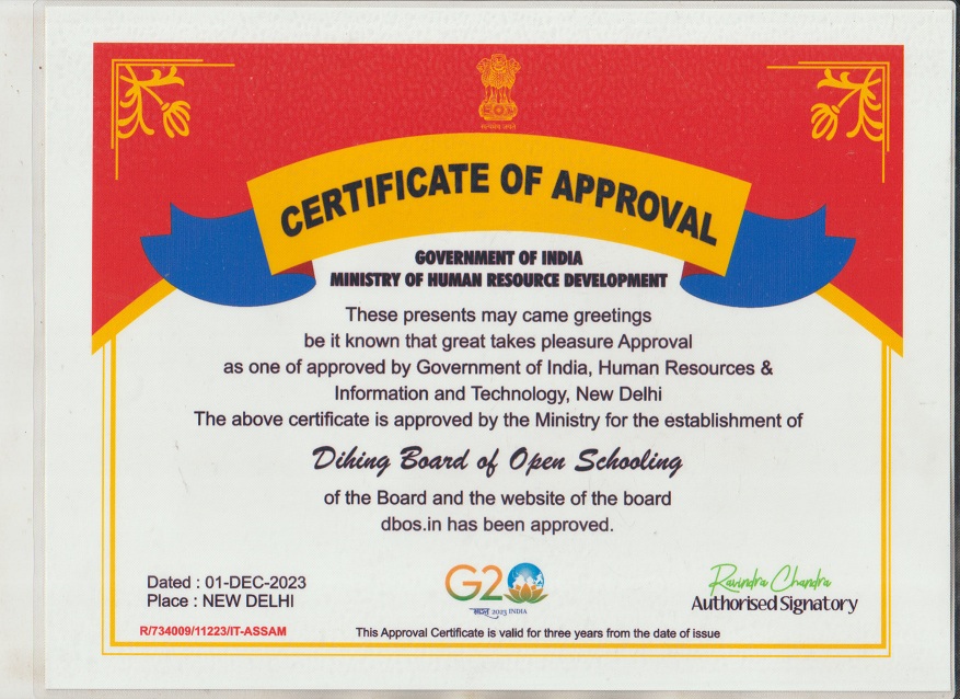 - ↪Ministry of Education (HRD) Approval – Official Notification for Dihing Board of Open Schooling (DBOS) – Click Here